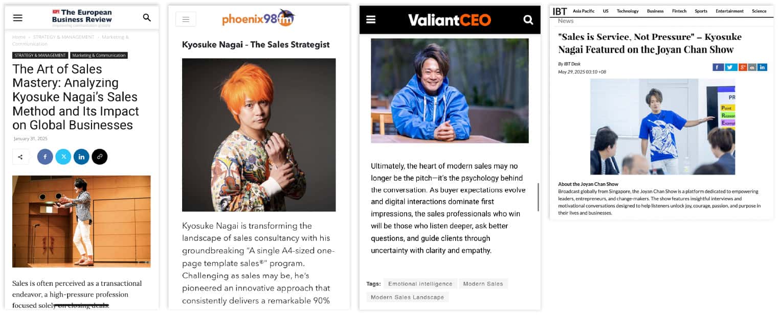 きょーすけさんから心理学や脳科学に裏付けされたロジックを学んだ事で、過去1年間1件も営業が取れなかったのが、2週間で30万円、60万円、50万円と立て続けに高額コンサルの契約が取れるようになりました。しかも、商談のその場で「即決」!魔法のようなメソッドに過去の営業のトラウマも払拭されました。